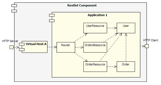 To summarize, a request contains an URI that identifies the target resource that is the subject of the call. This information is stored in the Request.resourceRef property and serves as the basis of the routing as we saw. So the first goal when handling a request is to find the target resource which is in the framework… an instance of the ServerResource class or more precisely one of its subclasses. To help us in this task, we can use the dedicated Finder, a subclass of Restlet, which takes a ServerResource class reference as an argument and which will automatically instantiate it when a request comes in. The resource will dynamically dispatch the call to either a matching annotated method or to a predefined method (get(), post(), put(), delete(), etc.). Of course, this behavior can be customized. There is even an attach() method on Router that can take two arguments, an URI template and a ServerResource class and that transparently creates the Finder for you. Now, let’s have a look at this overall diagram, showing the relationship between the main framework classes involved in this example: