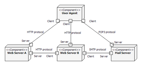 Note that the same component can have any number of client and server connectors attached to it. Web Server B, for example, has both a server connector to respond to requests from the User Agent component, and client connectors to send requests to Web Server A and the Mail Server.