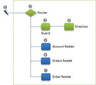 router.attach("/users/{user}/orders/{order}", order);Note that the routing assumes that your request contains an absolute target URI that identifies a target resource. During the request processing the resource’s base URI is continuously updated, for each level in the hierarchy of routers. This explains why the default behavior of routers is to match only the beginning of the remaining URI part and not the totality of it. In some cases, you might want to change this default mode, and this is easy to do via the “defaultMatchingMode” property on Router, or by modifying the “matchingMode” property of the template associated with the route created by the Router.attach() methods. For the modes, you can use the Template.MODE_EQUALS or Template.MODE_STARTS_WITH constants.