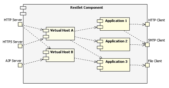 In addition to supporting the standard REST software architecture elements as presented before, the Restlet Framework also provides a set of classes that greatly simplify the hosting of multiple applications within a single JVM. The goal is to provide a RESTful, portable and more flexible alternative to the existing Servlet API. In the diagram below, we can see the three types of Restlets that are provided in order to manage these complex cases. Components can manage several Virtual Hosts and Applications.